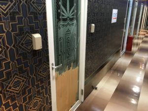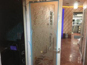 カラオケ店個室ドアのガラスが割れたため交換対応【相模原市南区】